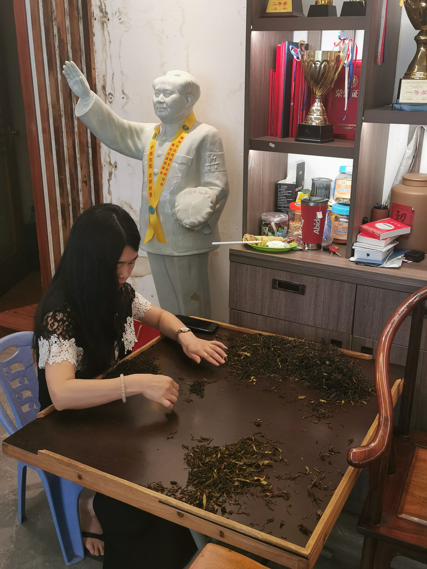 Notice anything interesting in the background? That is a 1.3-meter-tall, ceramic, Cultural Revolution-Era Mao Zedong statue. Notice the Red Guard armband on his left sleeve. The owner told me that, “Mao Zedong is our leader”! (毛泽东是我们的领袖!).