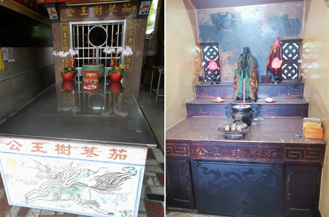 Pictured (3 of 3): this Taiwan Province, Nantou ancestral temple was explained in two previous Substack posts (see June 1 and 2). This ancestral temple adds a Local/Land God shrine. Local gods predate Confucism, Daoism and Buddhism by millennia and instead of replacing them, they have been absorbed into popular religious practice. They were often an ancient local king/duke/governor, general or other celebrated citizen who became deified over time. They can manifest luck, fortune, business, health, fertility & food (usually a goddess), military prowess, agriculture/weather and the other hopes and dreams of daily life. Sometimes it was a married couple and in the case above, with two gods portrayed, they might have been brothers, father and son, etc.